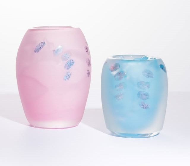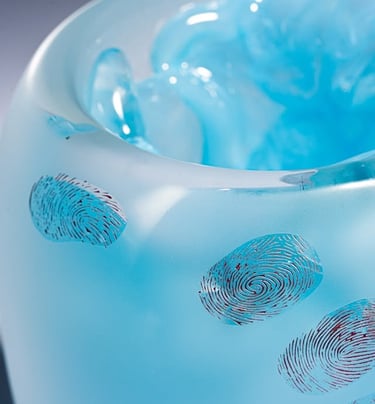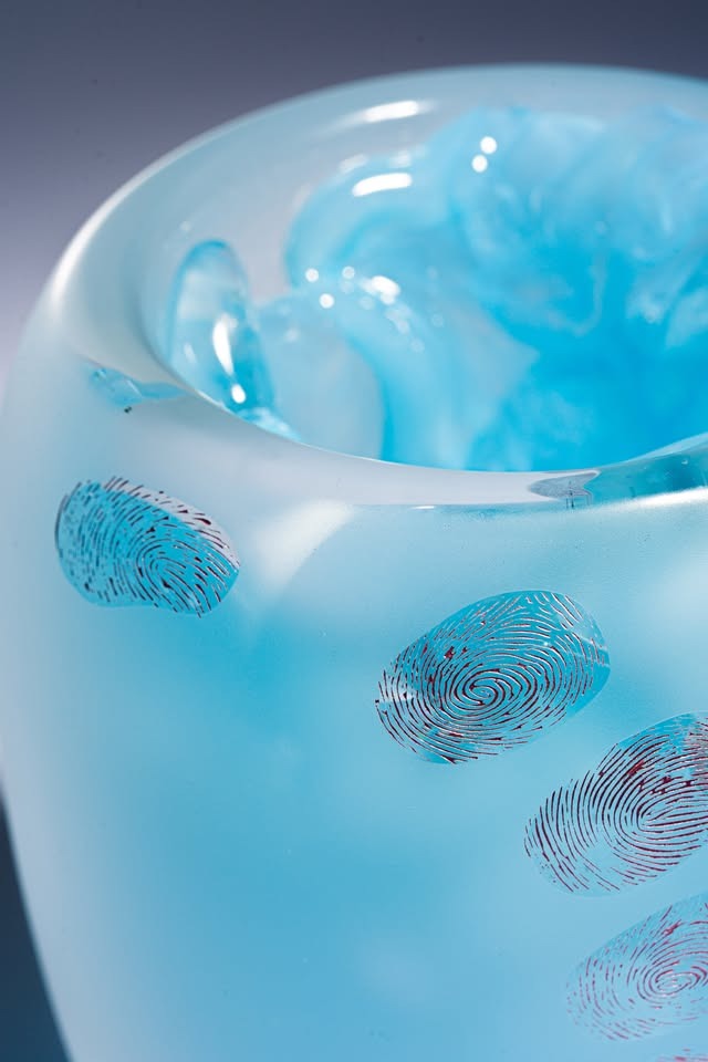 Jádro vzniká litím hmoty do foukaného tvaru, pískovaný povrch doplňují autorské otisky prstů.