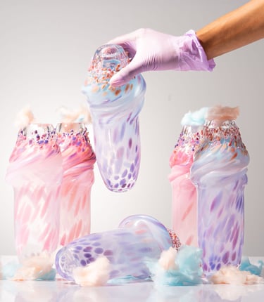 Hide&See Bubblegum a Ice-blue jsou volně foukané objekty bez formy – neřízený experiment, gesto svobody, odmítnutí hry a autorská strategie přežití. Název obrací pohled dovnitř: místo potvrzení zvenčí se učíme vidět vlastní jádro. Vzniká volně, z radosti z tvorby a intuice, bez tlaku. Hide je jemný povrch, maska a přetvářka narušená otisky – stopa a DNA autorky, narušitelky systému. See je deformované barevné jádro, individualita, emoce a jinakost. Dílo ironizuje systém vyžadující role a plán, vzniká náhodou a přítomností.