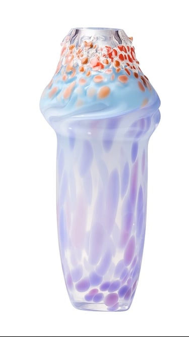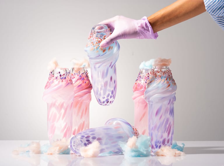 Pigmentovaný prášek je přimíchán do hmoty, která je postupně vlévána do volně vyfouknutého tvaru. Tekutá vrstva se usazuje, stéká, zahušťuje se a vytváří vnitřní kresbu, kterou nelze zopakovat ani kontrolovat. Každý objekt je záznamem konkrétního okamžiku – fyziky, času a rozhodnutí.