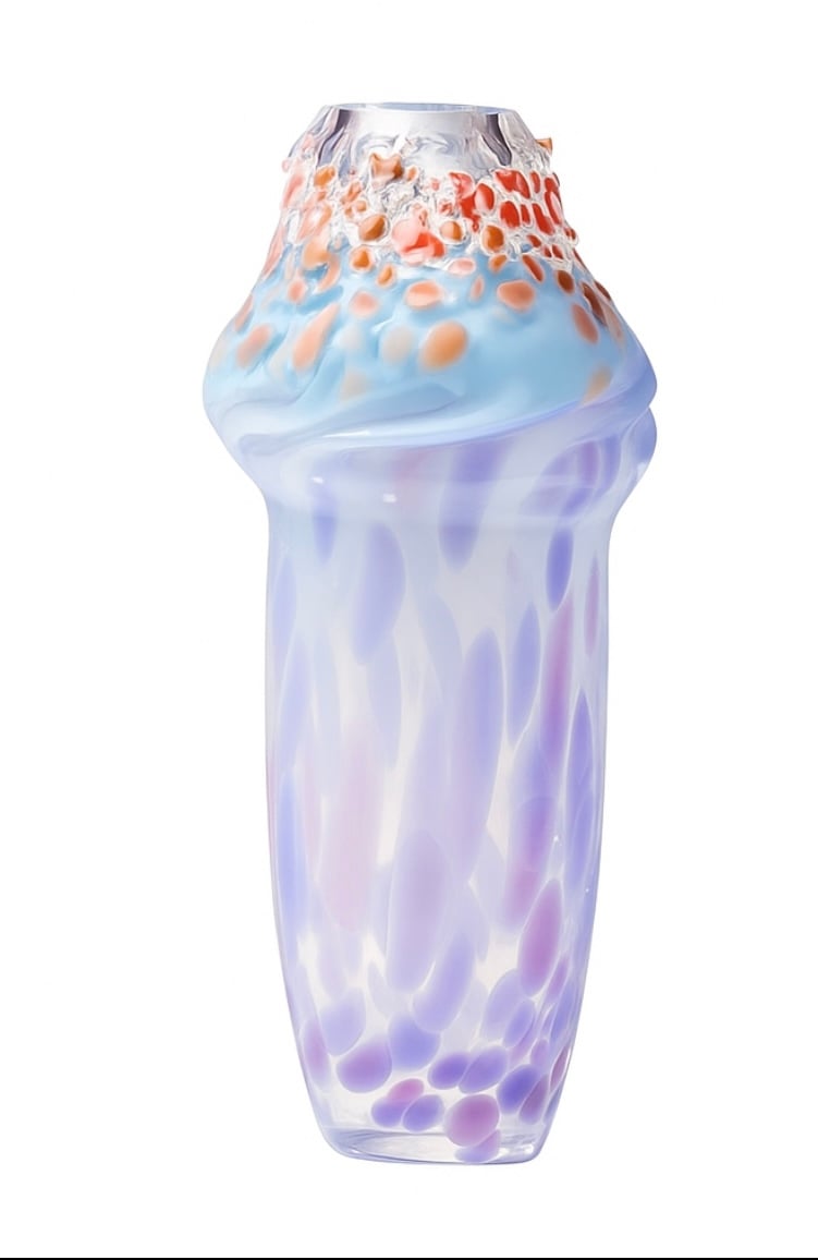 Jádro vzniká litím hmoty do foukaného tvaru, pískovaný povrch doplňují autorské otisky prstů.